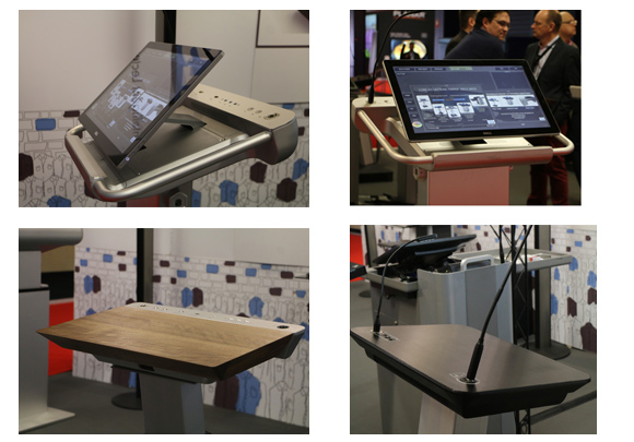 We brought along our ILS16 teaching lectern, to configure to your needs. The ILS11 regular height adjustable aluminum top lectern – which we showed not so regular with integrated German engineered sound: a speaker array in the top and a subwoofer in the lectern base. The all new ILS22M integrated presenter lectern with room control and keyboard under a single sheet of PCT glass made especially for us by Zytronic UK, now with our extremely responsive implementation of multi-touch. Its different sections are seen by Windows 8 as native touch screen, keyboard and touch pad HID's. CONTROL/ALT/DEL to logon is no longer an issue on our touch based system!